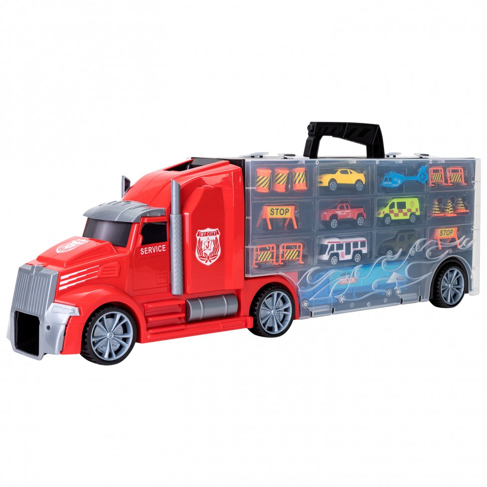 • Автовоз 2 в 1: игрушечный грузовой автомобиль и система хранения для маленького транспорта.