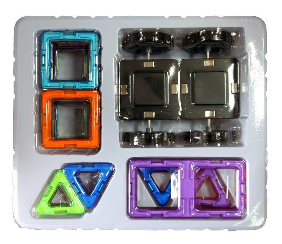 Комплектация из 34 деталей - это квадраты, треугольники, прямоугольник и 2 пары колес.
