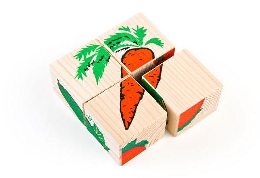 4 красочных кубиков с изображением овощей, которые нужно сложить в целую картинку. В изготовлении применена высококачественная древесина хвойных пород. Изображение нанесено методом шелкографии и очень износоустойчиво. Материалы разрешены для изготовления детских игрушек и имеют гигиенические заключения.