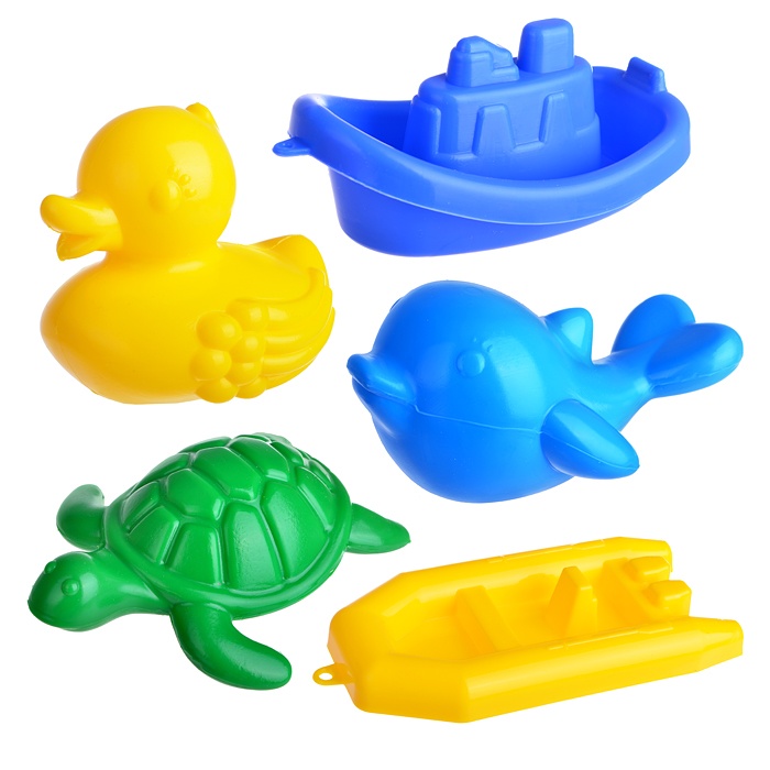 Набор игрушек из пяти предметов: кораблика, лодки, утенка, дельфина, черепахи значительно разнообразит игры детей с водой на свежем воздухе. Их можно запускать в надувном детском бассейне или в ванне.