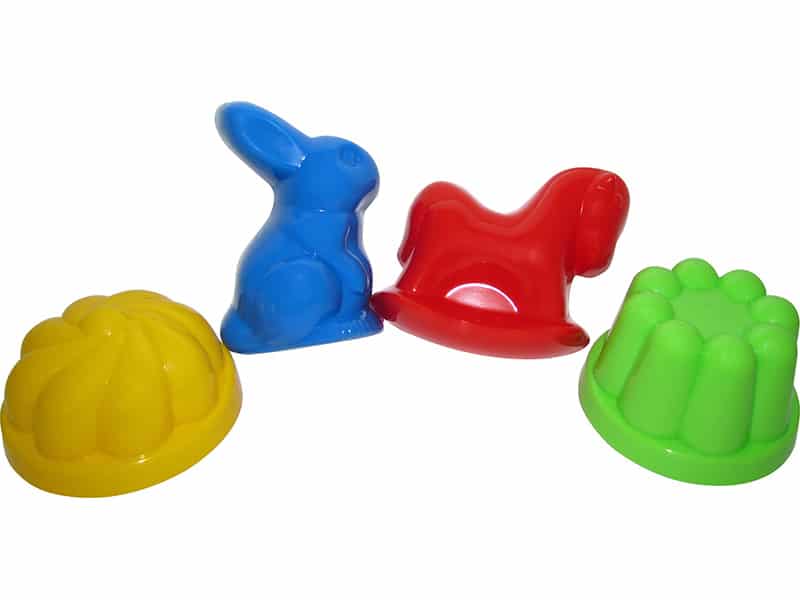 2 обычные формочки и 2 в виде зайчика и лошадки для игры в песочнице.