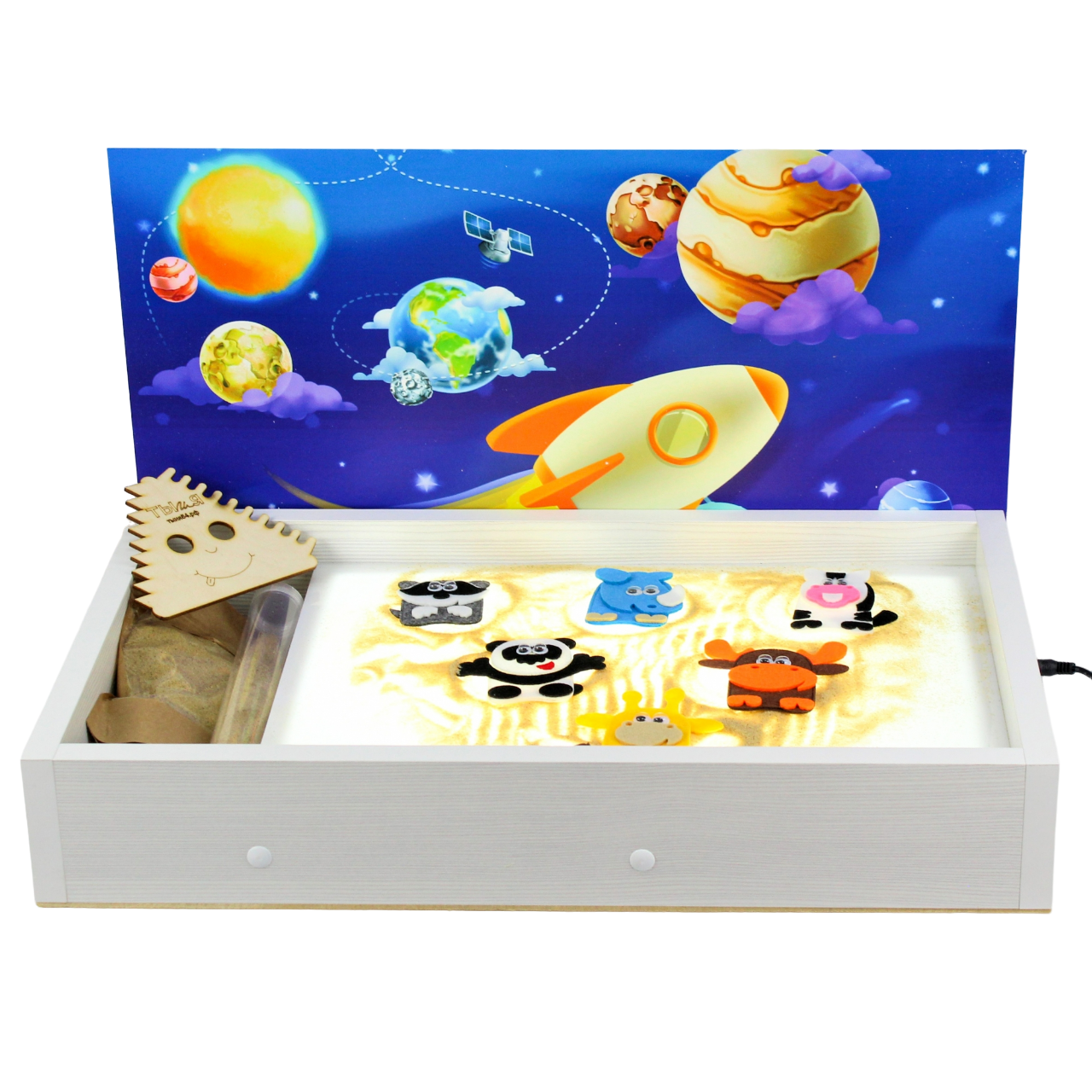 Отсек для хранения песка: 90 мм. Песок: 500 г в комплекте мелкой фракции 0,1-0,3 мм.