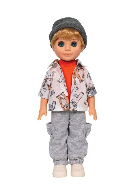 Комплект одежды включает в себя футболку, рубашку с коротким рукавом принт «собачки», спортивные штаны с накладными карманами, шапку, кроссовки и нижнее бельё.