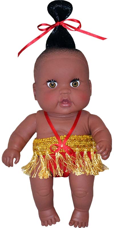 Кукла с африканской внешностью одета в милый костюмчик, а на голове у нее интересная прическа.