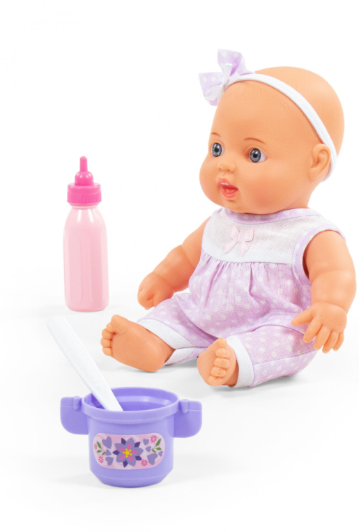 В комплект идут аксессуары в виде бутылочки с соской, чашечки и ложечки.