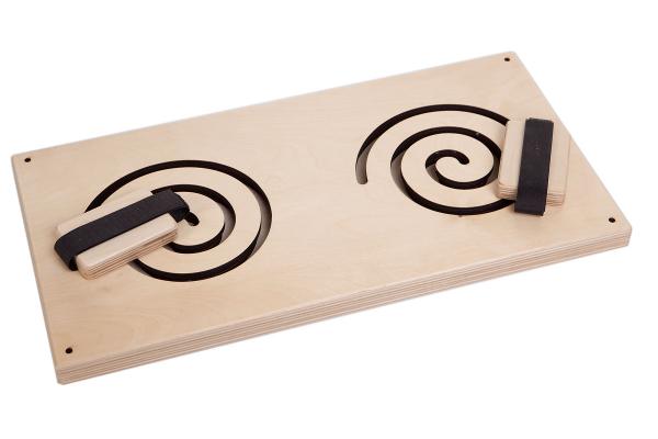 На конструкции вырезаны две траектории, по которым детям нужно переместить подвижные фишки параллельно при помощи рук или ног. Компактное изделие можно использовать как на стене, так и на столе или полу.