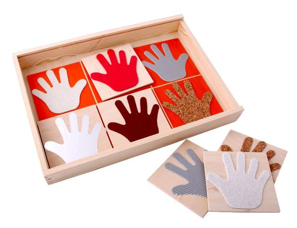 Состав: 6 пар ладошек, сделанных из материалов различной фактуры и приклеенных на деревянные квадраты.