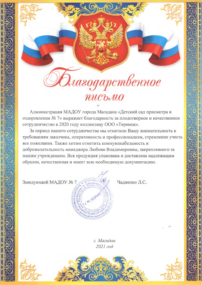 Выражаем благодарность за плодотворное и качественное сотрудничество в 2020 году коллективу ГК "Теремок".