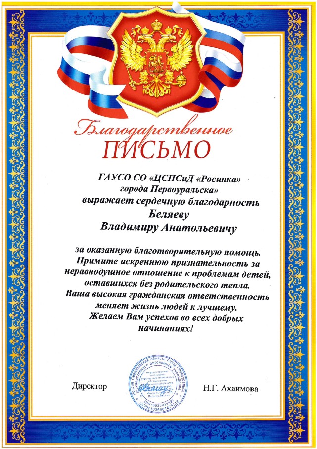ГАУСО СО "ЦСПСиД "Росинка" города Первоуральска" благодарит директора компании ГК "Теремок" за оказанную благотворительную помощь. Примите искреннюю признательность за неравнодушное отношение к проблемам детей, оставшихся без родительского тепла. Ваша высокая гражданская ответственность меняет жизнь детей к лучшему. Желаем Вам успехов во всех начинаниях!