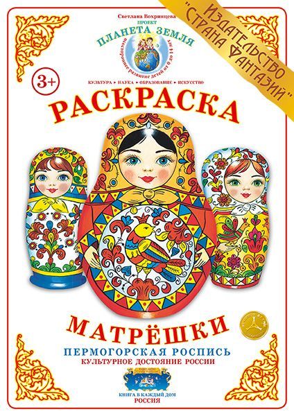 Раскраска содержит предметные картинки, изображающие красочных матрешек с элементами пермогорской росписи.