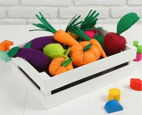 Внутри четыре грядки (мягконабивные валики между которыми можно фиксировать овощи),семь видов овощей (капуста, морковь, секла, лук, редис, тыква, баклажан), карточки с играми.