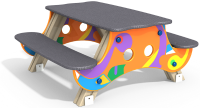 Яркий стол со скамейками для детей от 2 до 7 лет. Сделан из фанеры, стойкой к воздействию воды, все углы закруглены в целях безопасности не менее чем на 20мм. Окрашен специальной краской для детских площадок. Все заглушки выполнены из пластика.