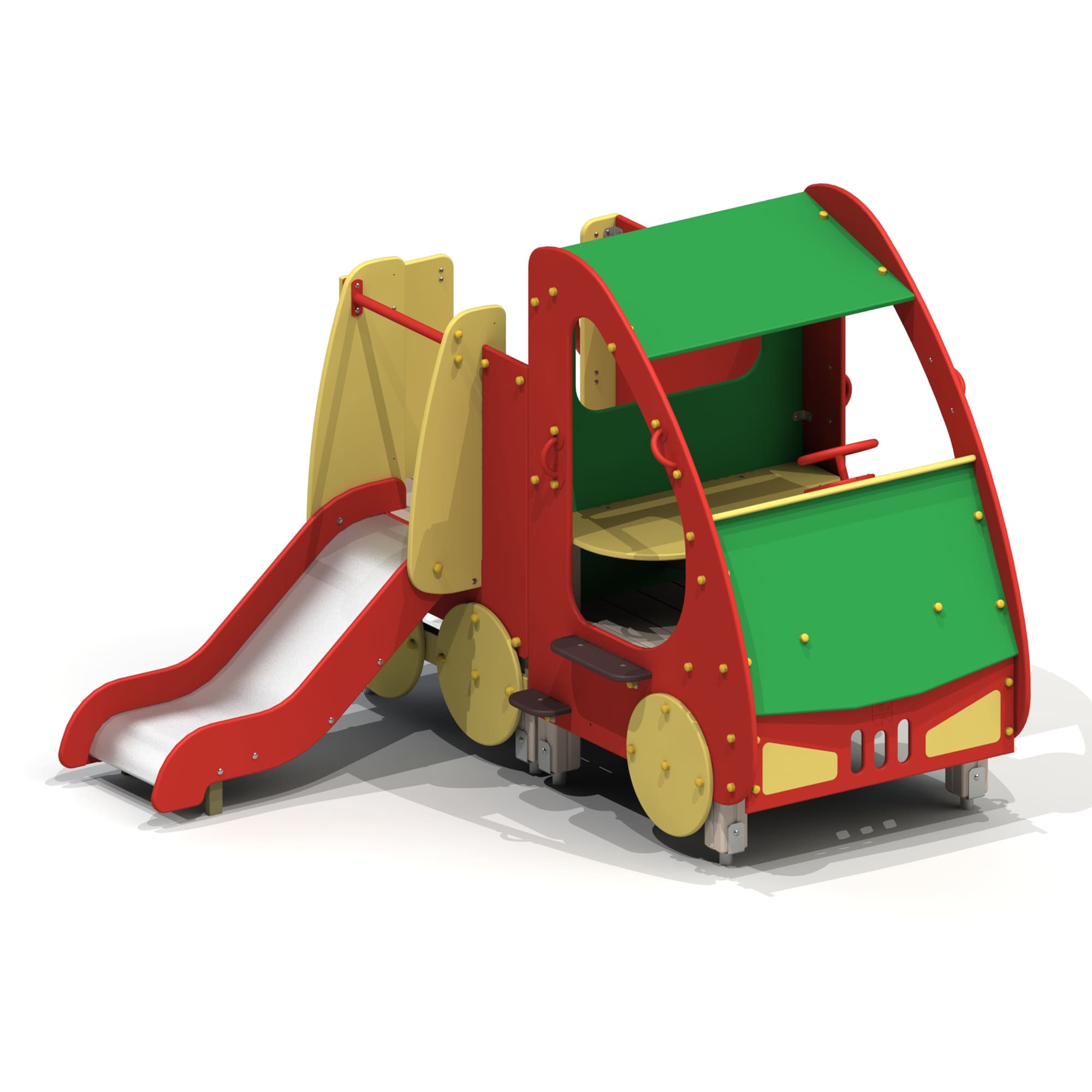 Машинка должна представлять собой модульную сборно-разборную конструкцию, состоящую из двух башен, имитирующих кабину и кузов машины. К башне 1, с крышей, с высотой площадки не менее 555 мм, должны быть пристроены: боковые стенки с входом, к которым крепятся две ступеньки и поручень, декоративные элементы в виде колес, задняя стенка с фигурным вырезом, к которой крепится скамейка, передняя стенка с декоративными элементами в виде решетки радиатора, фар и панели с рулем, педалью и рычагом передач. К башне 2, с высотой площадки не менее 650 мм, должны быть пристроены: фанерное ограждение, стенка с отверстиями для рук и ног и фигурным вырезом, поручни, горка. К ограждению с внешней стороны должны крепиться скамейка и декоративный накладной элемент в виде лопаты. По бокам установлены колеса. Несущие разновысокие столбы комплекса должны быть выполнены из клееного деревянного бруса сечением не менее 100х100 мм и иметь скругленный профиль с канавкой посередине. Снизу столб должен заканчиваться металлическим оцинкованным подпятником диаметром не менее 42 мм, который бетонируется в землю. Полы башен должны быть выполнены из деревянной доски толщиной не менее 40 мм. Стенки башен, ограждения, скамейки, альпинистская стенка, колеса должны быть изготовлены из влагостойкой окрашенной фанеры толщиной не менее 21 мм. Поручни должны быть выполнены из металлических труб диаметром не менее 33 мм и не менее 21 мм. Ступеньки должны быть выполнены из влагостойкой противоскользящей фанеры толщиной не менее 21 мм. Декоративные накладные элементы должны быть выполнены из влагостойкой фанеры толщиной не менее 15 мм. Горка должна состоять из ската, бортиков, защитной секции и защитной перекладины. Горка должна иметь стартовый участок высотой не менее 650 мм, участок скольжения и конечный участок. Скат должен быть изготовлен из единого листа нержавеющей стали толщиной 1,5 мм, утопленный в паз бортиков горки. Бортики горки, выполненные из влагостойкой фанеры толщиной не менее 21 мм должны быть высотой не менее 100 мм. Защитная перекладина должна быть выполнена из металлической трубы диаметром не менее 33 мм, побуждающая ребенка присесть и установлена на высоте не менее 600 мм от уровня поверхности стартового участка горки. Защитная секция горки должна быть выполнена из влагостойкой фанеры толщиной не менее 21 мм.